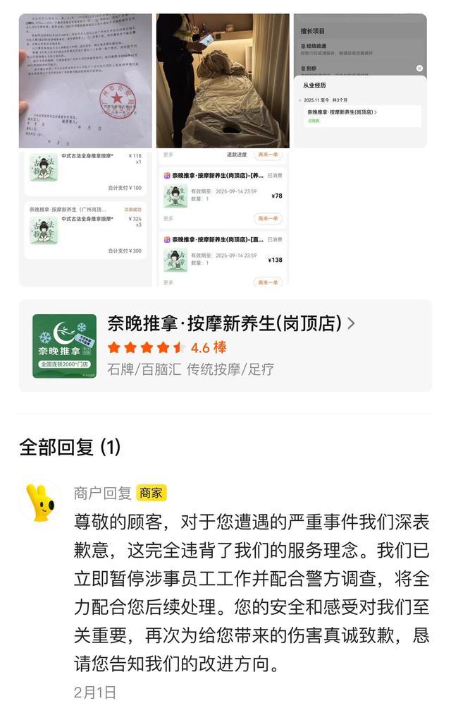 2月3日,广东一网友反映,自己在按摩店遭按摩技师猥亵,希望大家对该按摩店避雷。